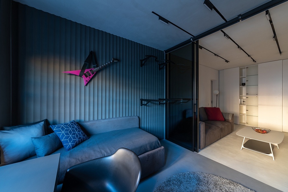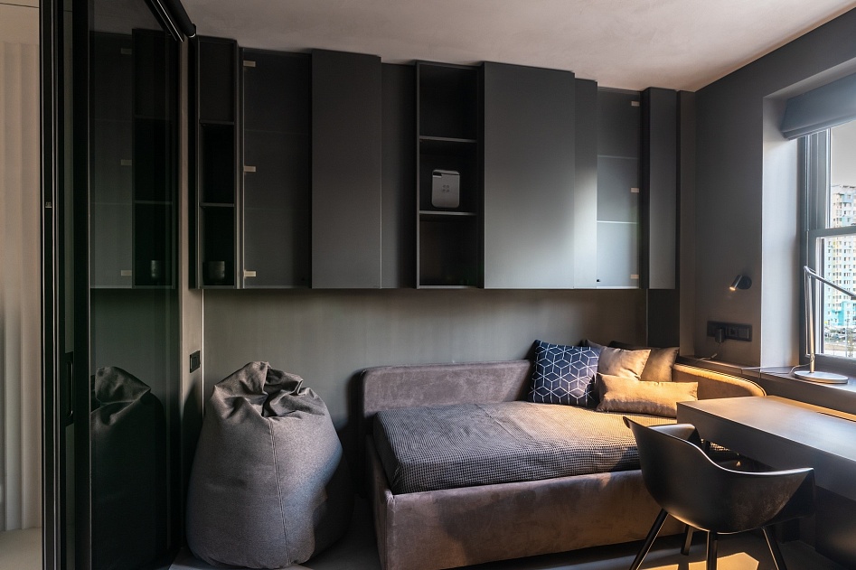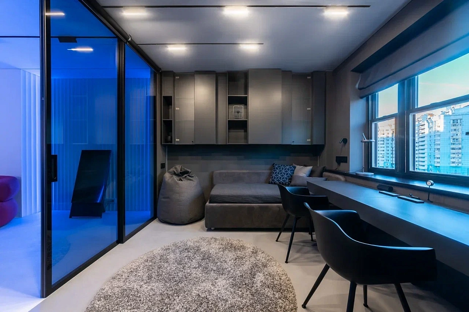 На небольшой площади дизайнерам удалось разместить сразу несколько зон: рабочую, спортивную и зону отдыха.