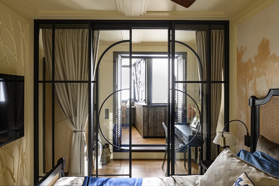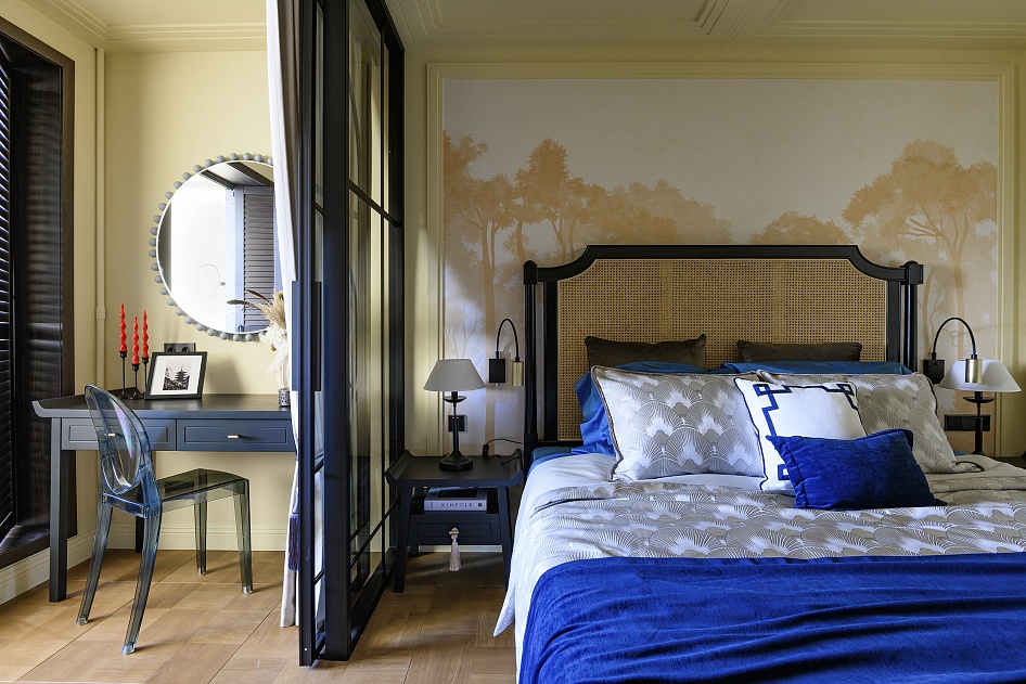 Комнату разделили на три функциональные зоны: спальная зона, будуарная зона и рабочее пространство на лоджии.