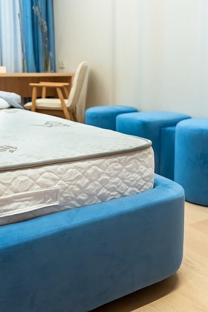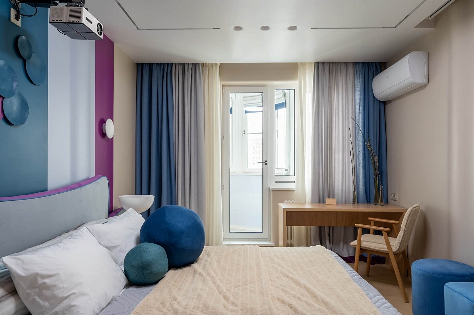 Детали интерьера бережно, но ненавязчиво напоминают о том,что герои любят спорт (через волнообразную, плавную геометрию интерьера – отсыл к волнам или элементы интерьера в виде подушек-шаров, круглых ножек прикроватных тумб или пуфика перед кроватью, напоминающих про футбол)