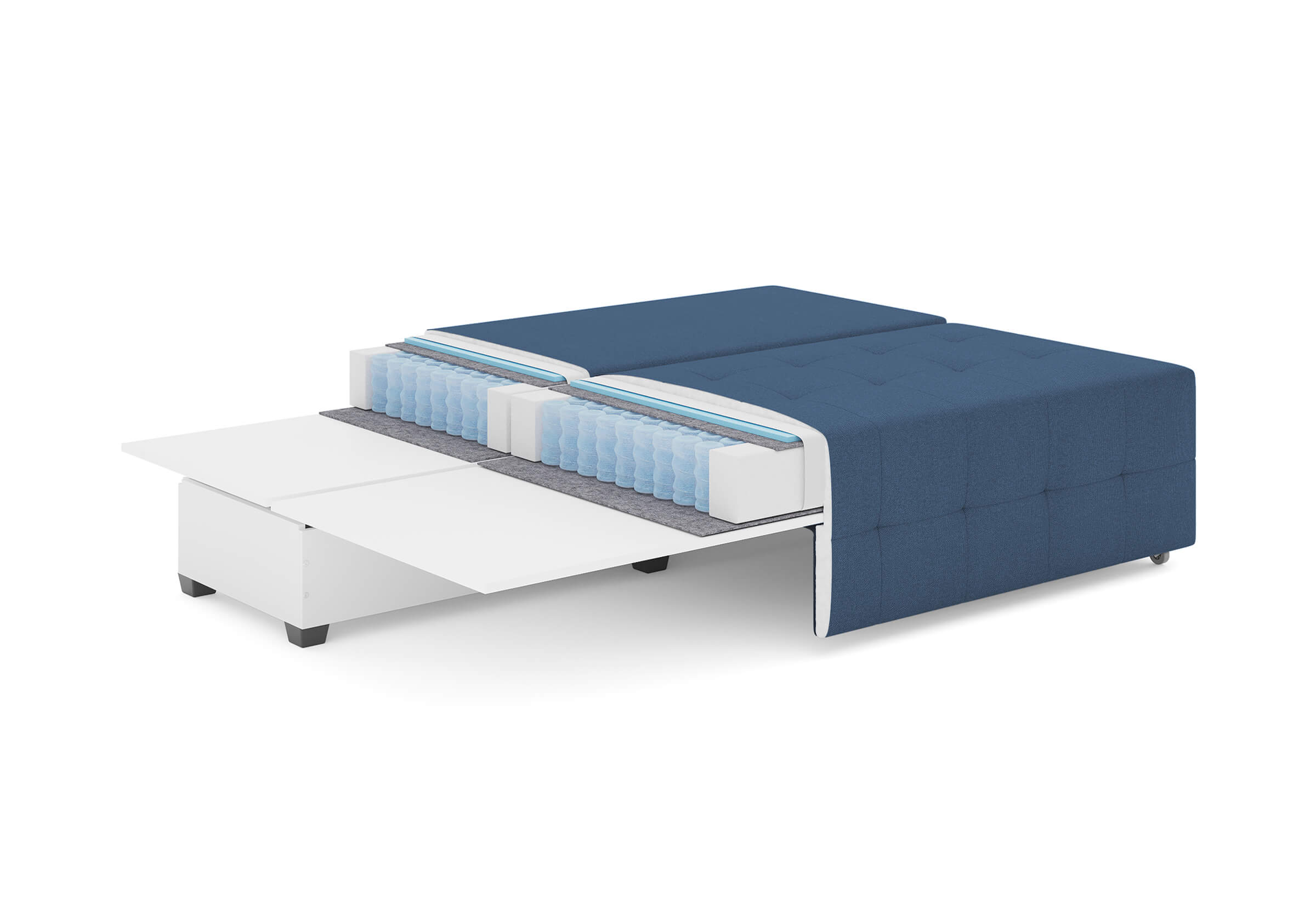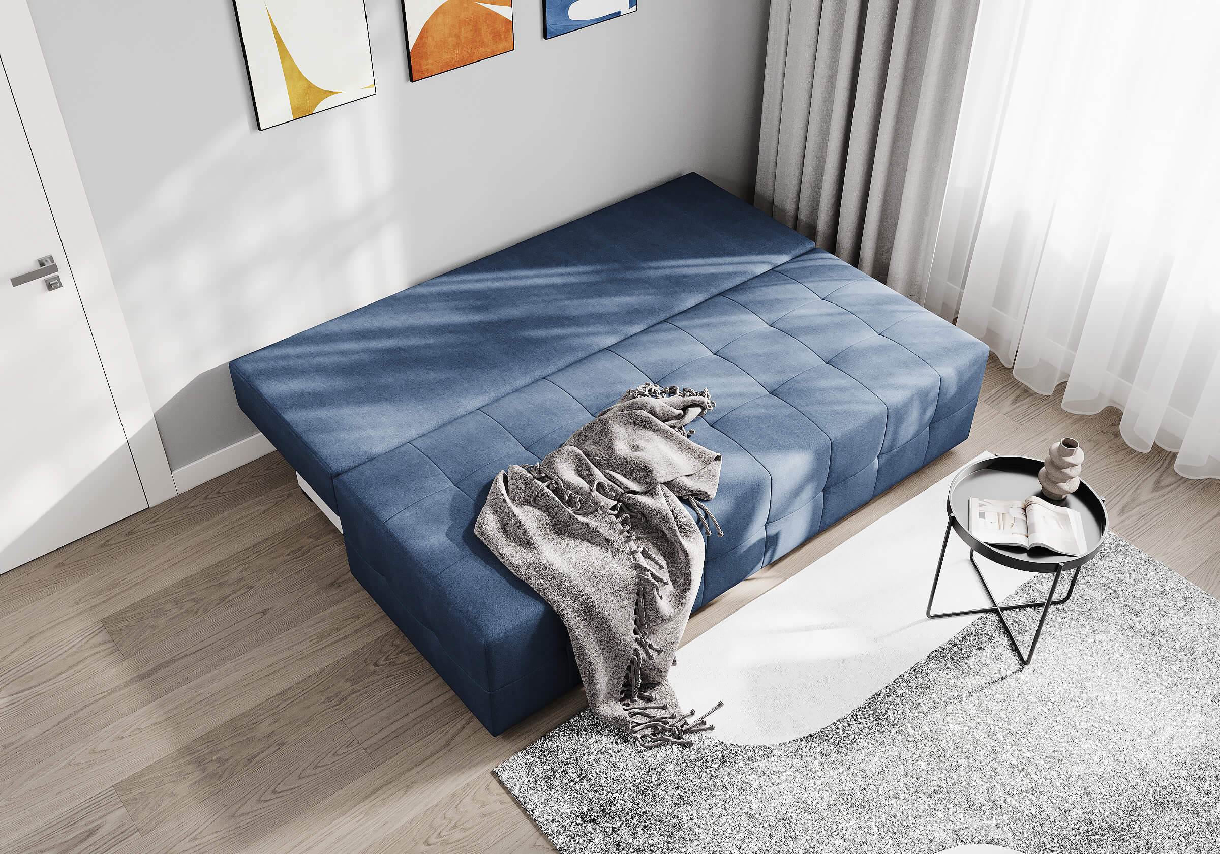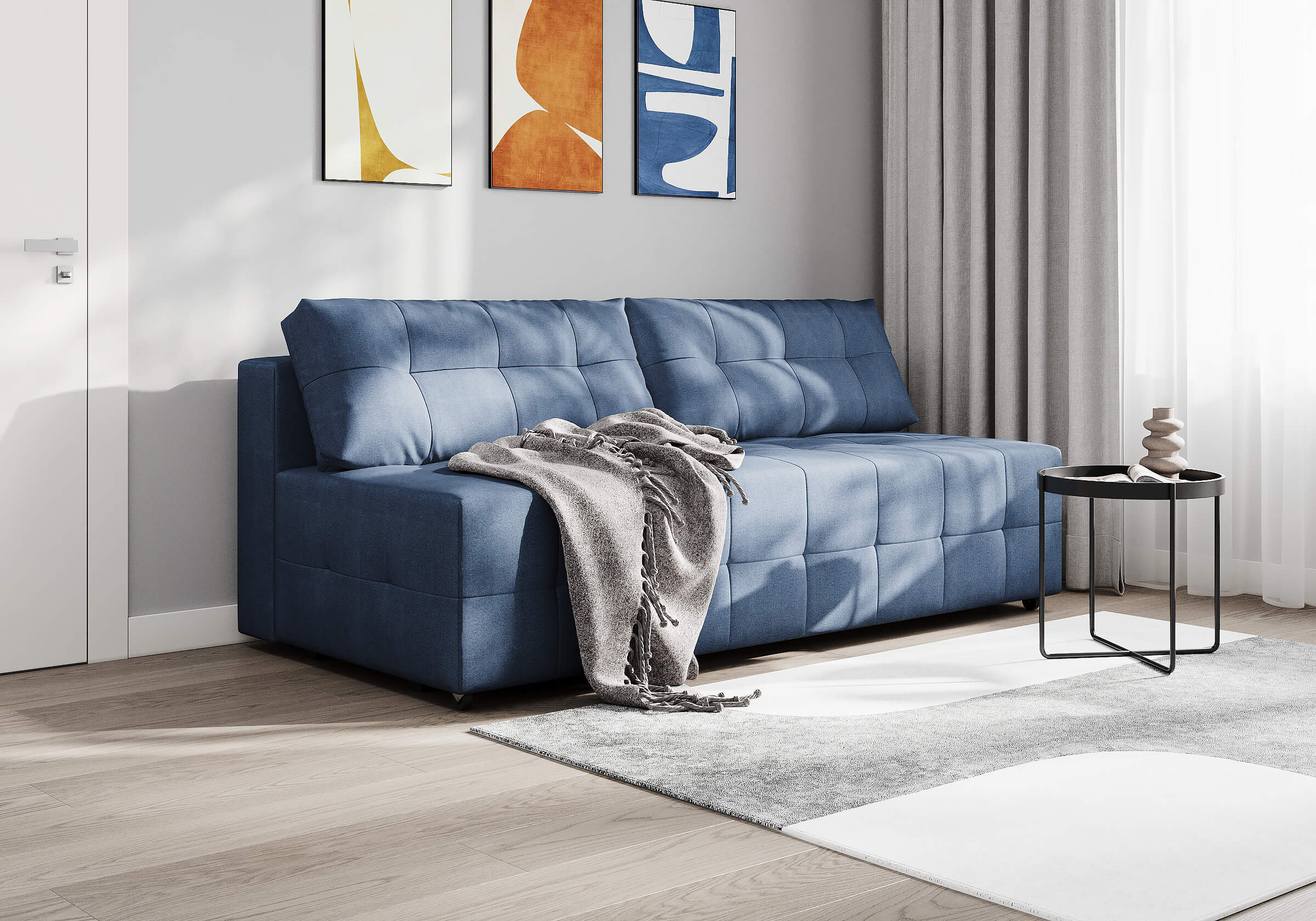 Диван в современном стиле без подлокотников с механизмом трансформации еврокнижка и коробом для хранения. Благодаря объемной стежке в форме квадратов, отсутствию подлокотников и минимальным габаритам диван подойдет для активного городского жителя. Матрас анатомический с независимым пружинным блоком обеспечит комфортное спальное место. В основе мягких подушек – микс наполнителей: поролоновая крошка не дает деформироваться, а синтетическое волокно добавляет комфорт.