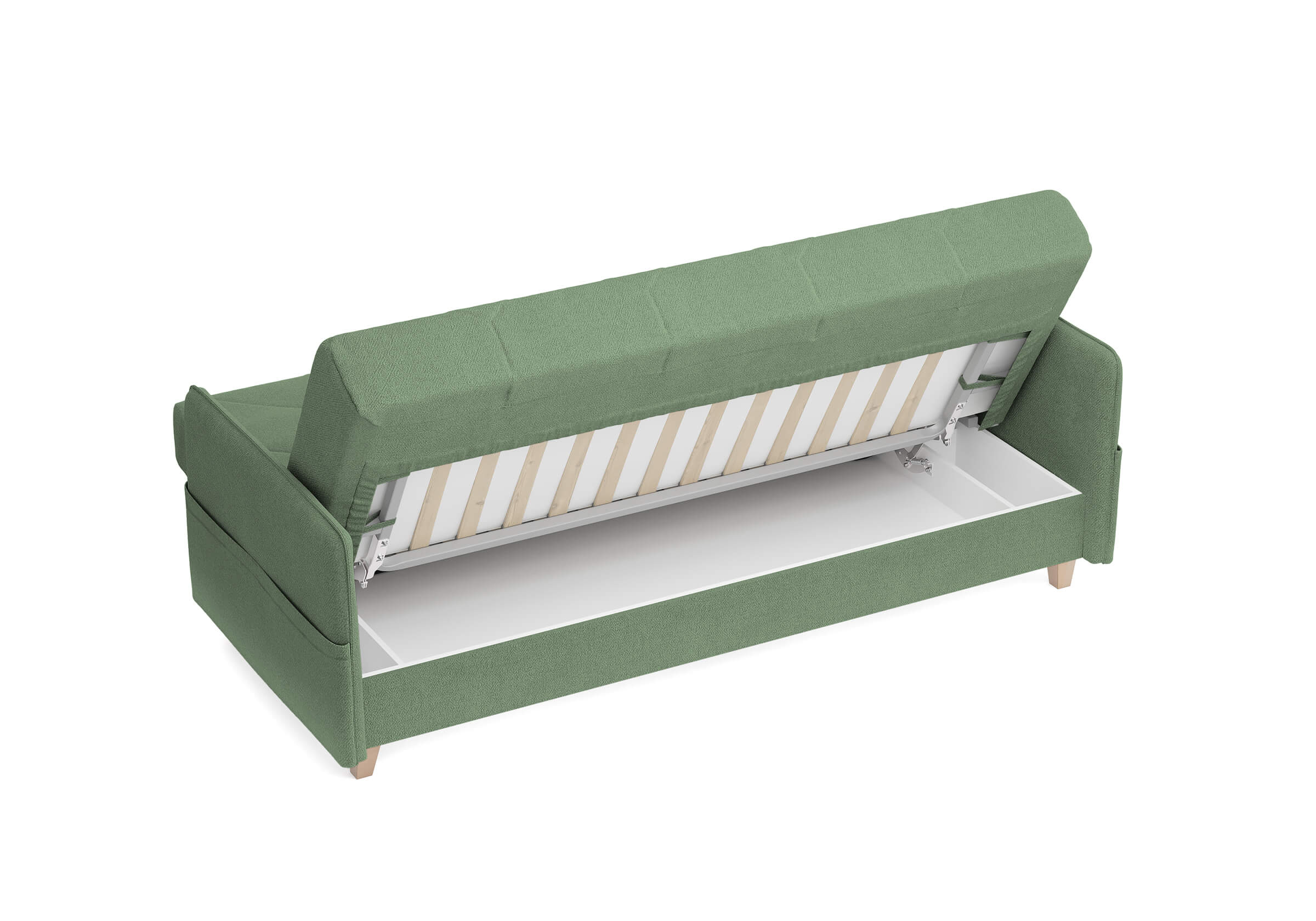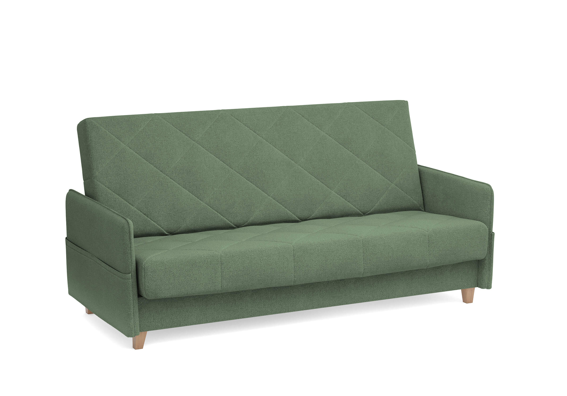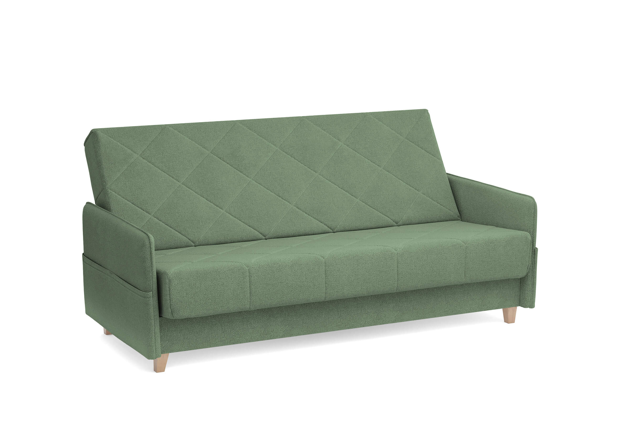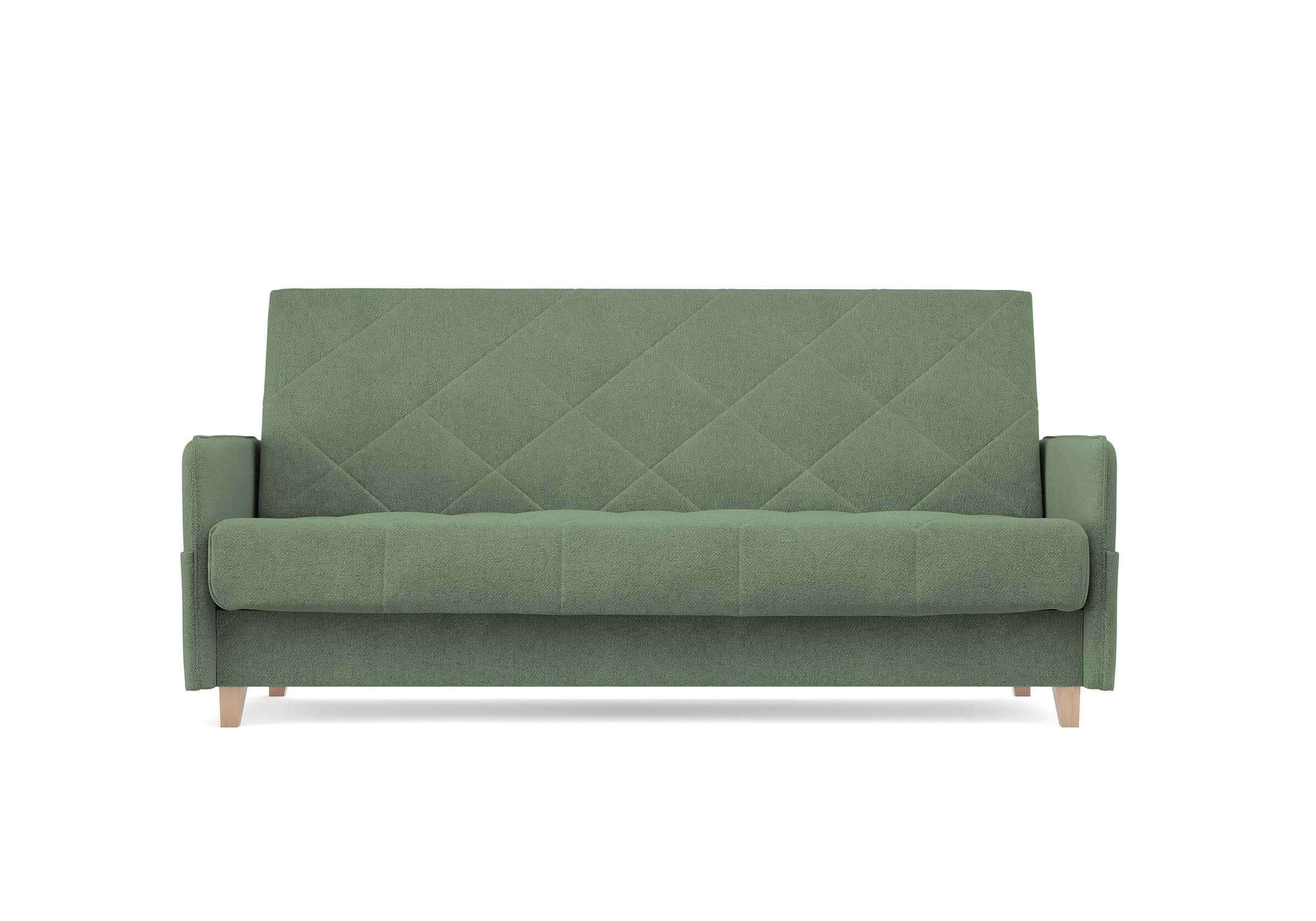 Диван для сна в скандинавском стиле с механизмом трансформации «клик-кляк», тонкими подлокотниками и коробом для хранения. Основание дивана металлическое, с ламелями. Матрас анатомический с независимым пружинным блоком. Благодаря съемному чехлу с объемной стежкой в форме ромбов, диван органично впишется в современные интерьеры в скандинавском стиле и стиле минимализм. Благодаря тонким подлокотникам у дивана минимальные габариты как в сложенном, так и разложенном виде. Широкие карманы-органайзеры на подлокотниках позволят хранить в доступе необходимые вещи. Forest имеет 3 положения трансформации: диван, кровать, релакс. Диван оборудован вместительным коробом для хранения. Опоры деревянные, натурального цвета, просвет над полом способствует легкой уборке под диваном, в том числе роботом-пылесосом.