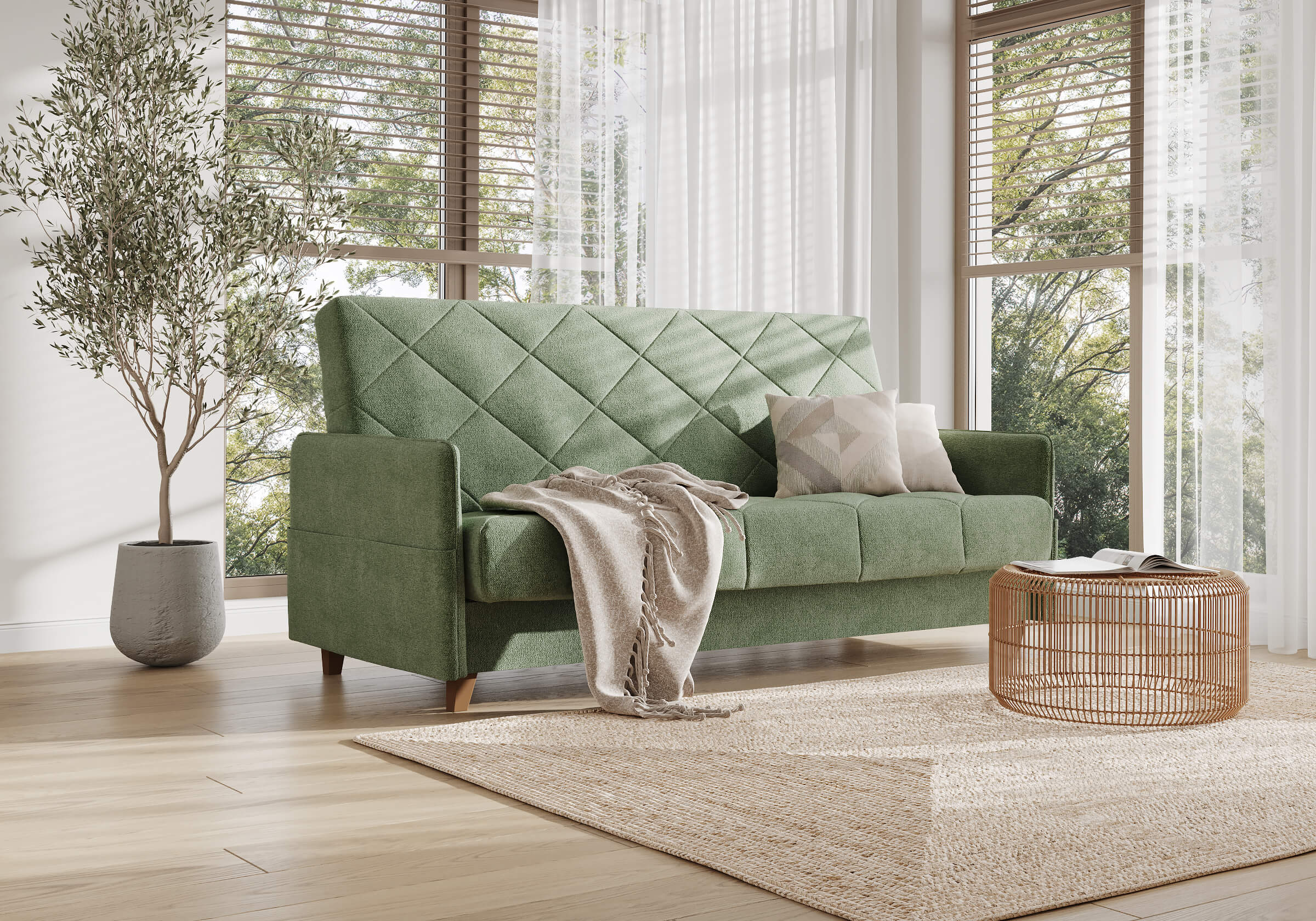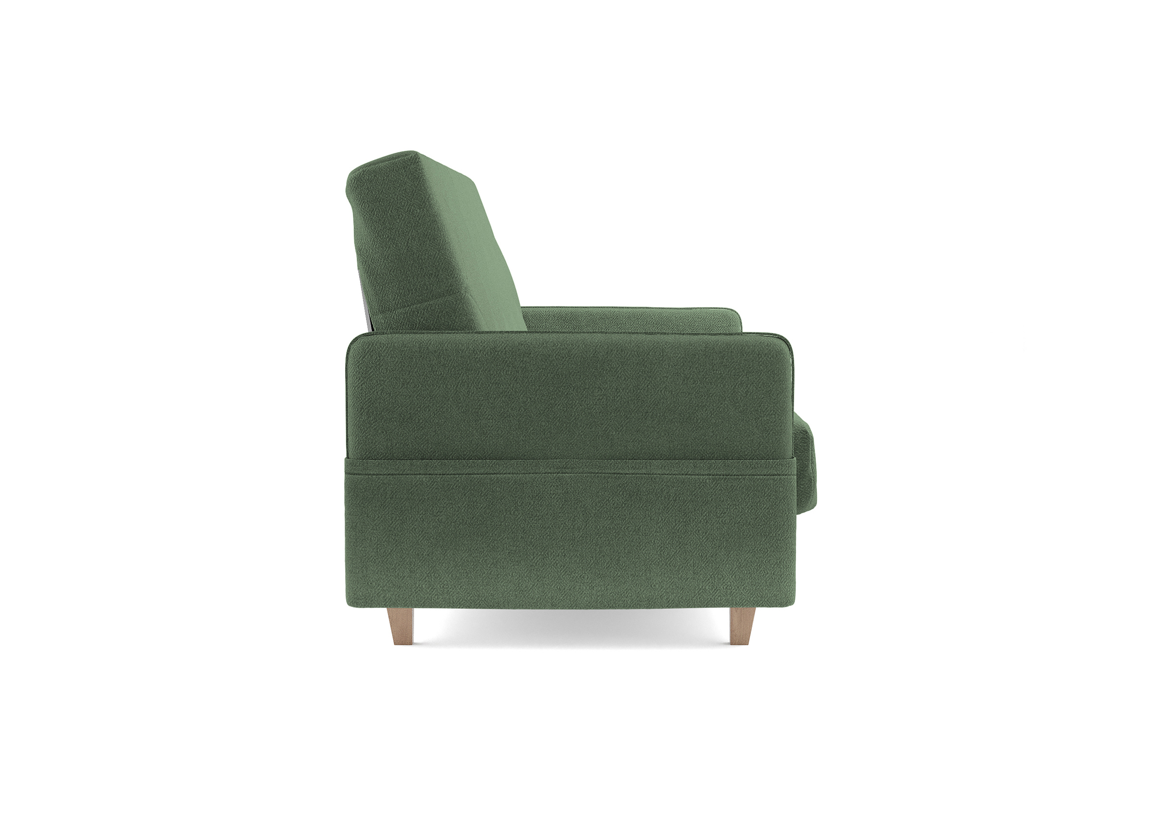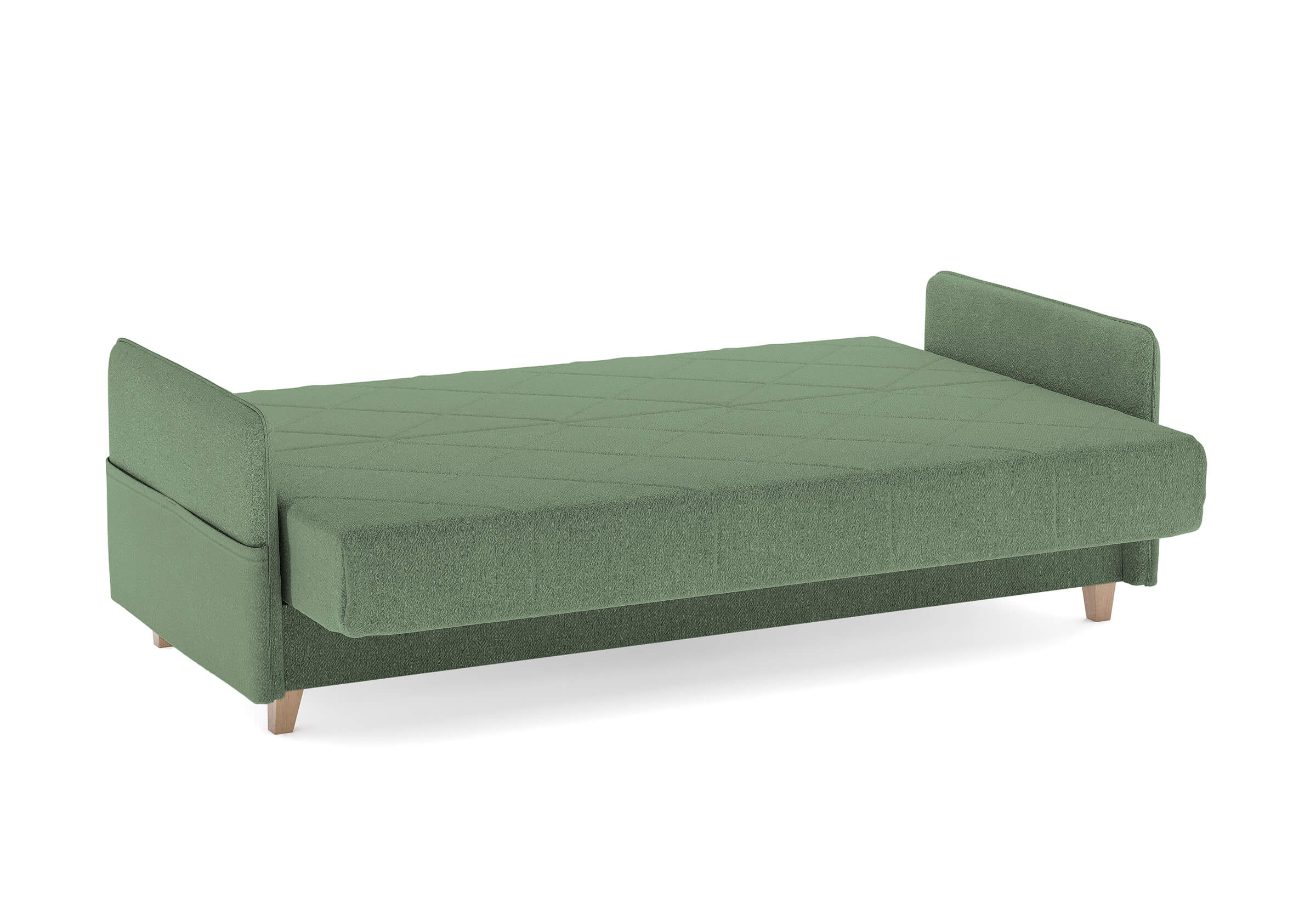 Диван для сна в скандинавском стиле с механизмом трансформации «клик-кляк», тонкими подлокотниками и коробом для хранения. Основание дивана металлическое, с ламелями. Матрас анатомический с независимым пружинным блоком. Благодаря съемному чехлу с объемной стежкой в форме ромбов, диван органично впишется в современные интерьеры в скандинавском стиле и стиле минимализм. Благодаря тонким подлокотникам у дивана минимальные габариты как в сложенном, так и разложенном виде. Широкие карманы-органайзеры на подлокотниках позволят хранить в доступе необходимые вещи. Forest имеет 3 положения трансформации: диван, кровать, релакс. Диван оборудован вместительным коробом для хранения. Опоры деревянные, натурального цвета, просвет над полом способствует легкой уборке под диваном, в том числе роботом-пылесосом.