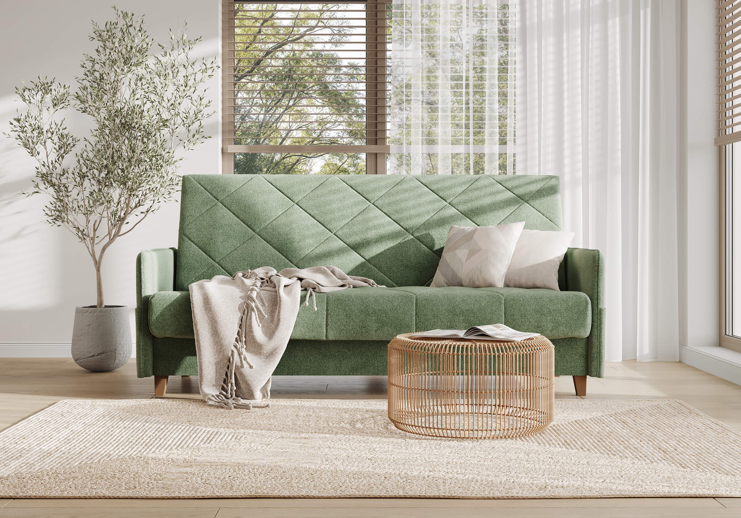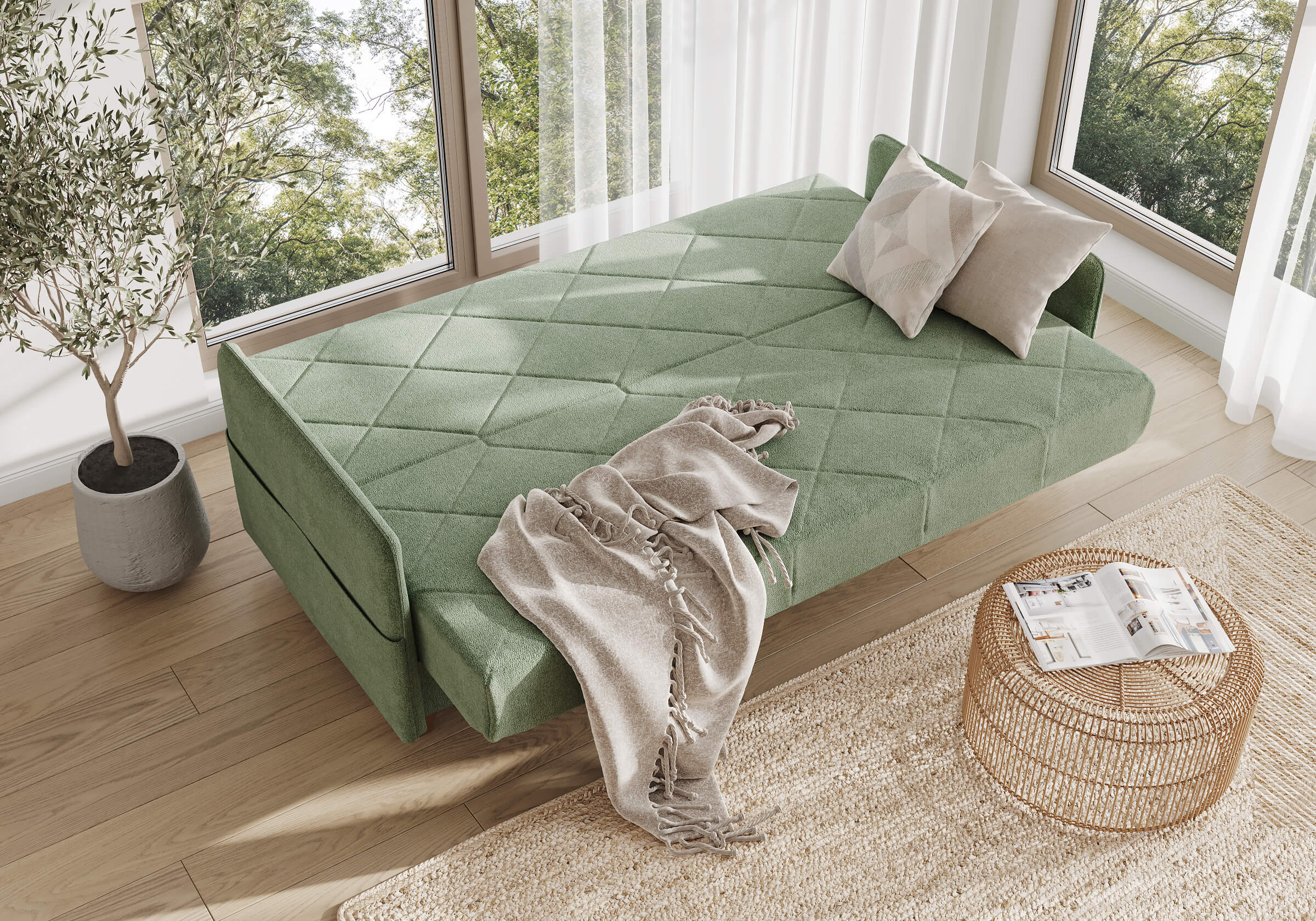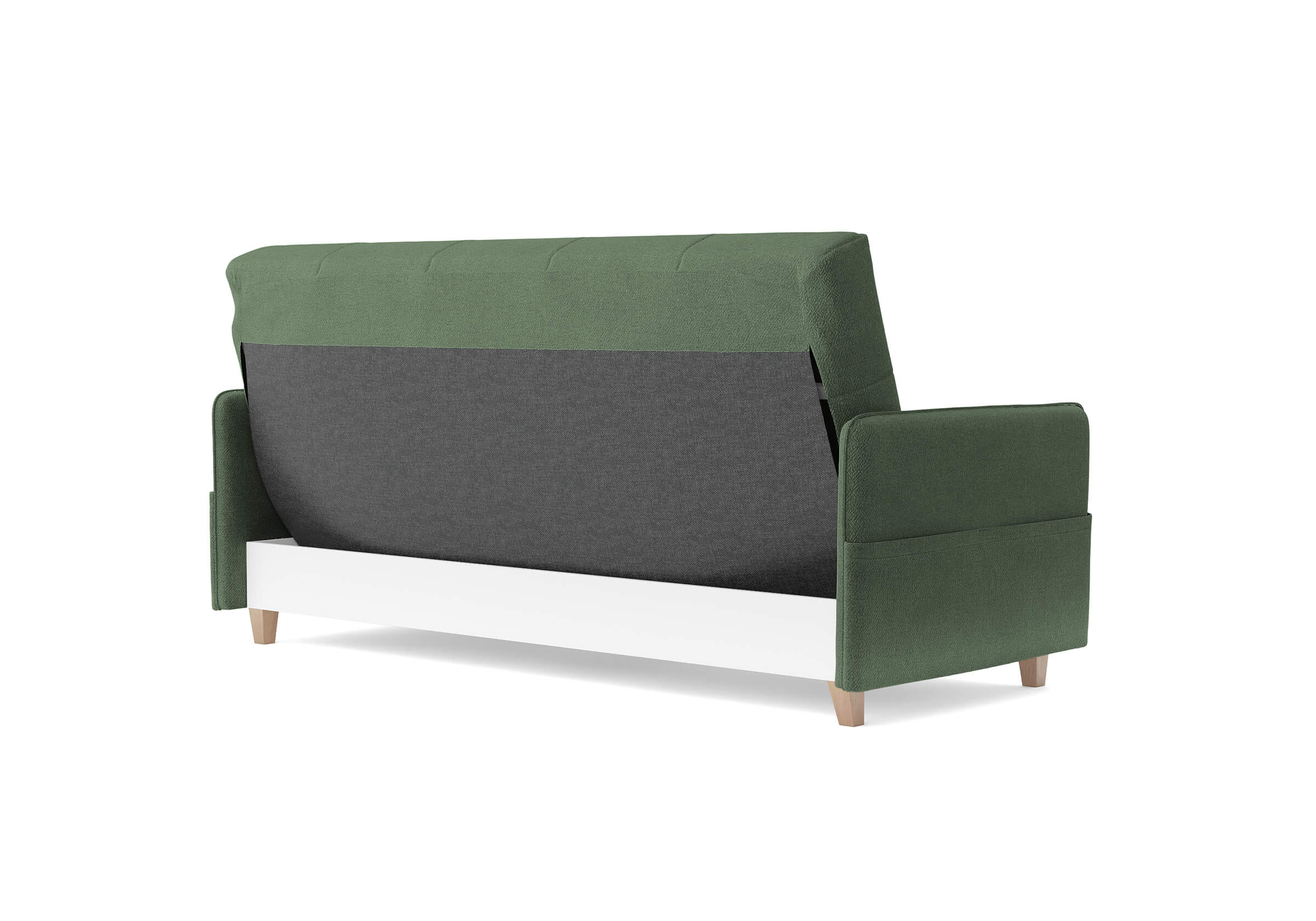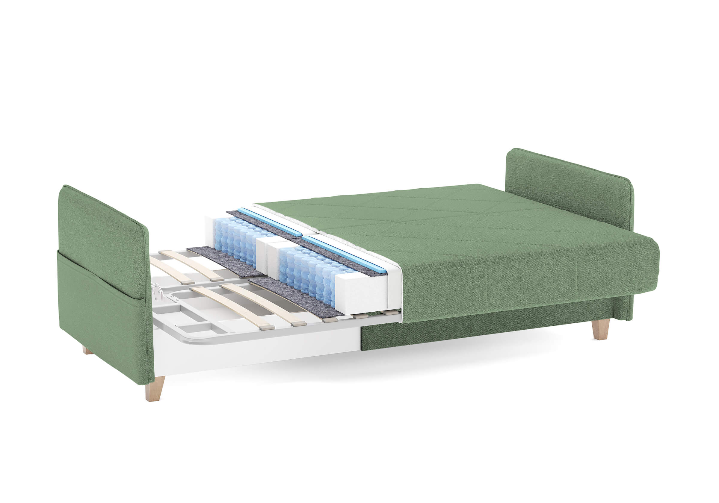 Диван для сна в скандинавском стиле с механизмом трансформации «клик-кляк», тонкими подлокотниками и коробом для хранения. Основание дивана металлическое, с ламелями. Матрас анатомический с независимым пружинным блоком. Благодаря съемному чехлу с объемной стежкой в форме ромбов, диван органично впишется в современные интерьеры в скандинавском стиле и стиле минимализм. Благодаря тонким подлокотникам у дивана минимальные габариты как в сложенном, так и разложенном виде. Широкие карманы-органайзеры на подлокотниках позволят хранить в доступе необходимые вещи. Forest имеет 3 положения трансформации: диван, кровать, релакс. Диван оборудован вместительным коробом для хранения. Опоры деревянные, натурального цвета, просвет над полом способствует легкой уборке под диваном, в том числе роботом-пылесосом.