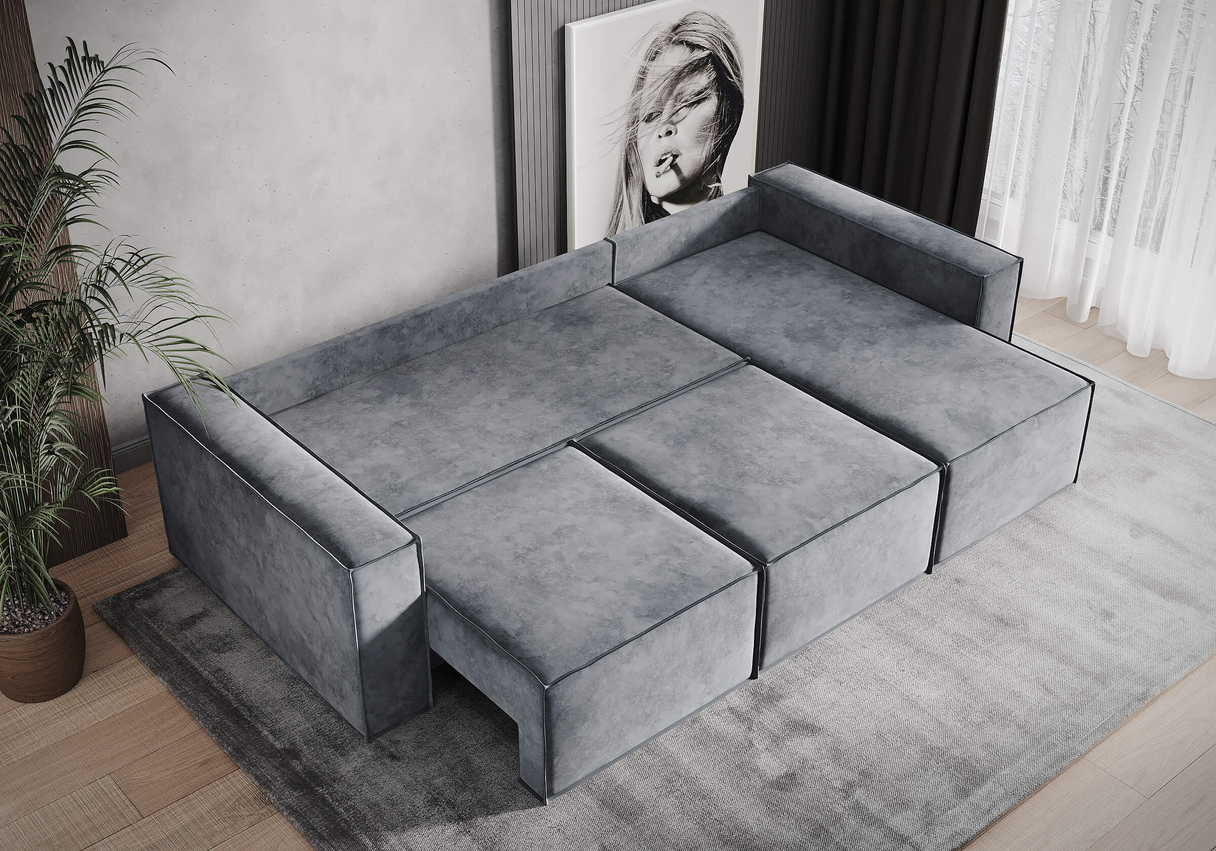Благодаря своей простой конструкции, диван легко вписывается в различные стилистические решения, от индустриального до современного минимализма. Декоративный кант, использованный в дизайне, добавляет изысканности и утонченности, не перегружая общий вид.