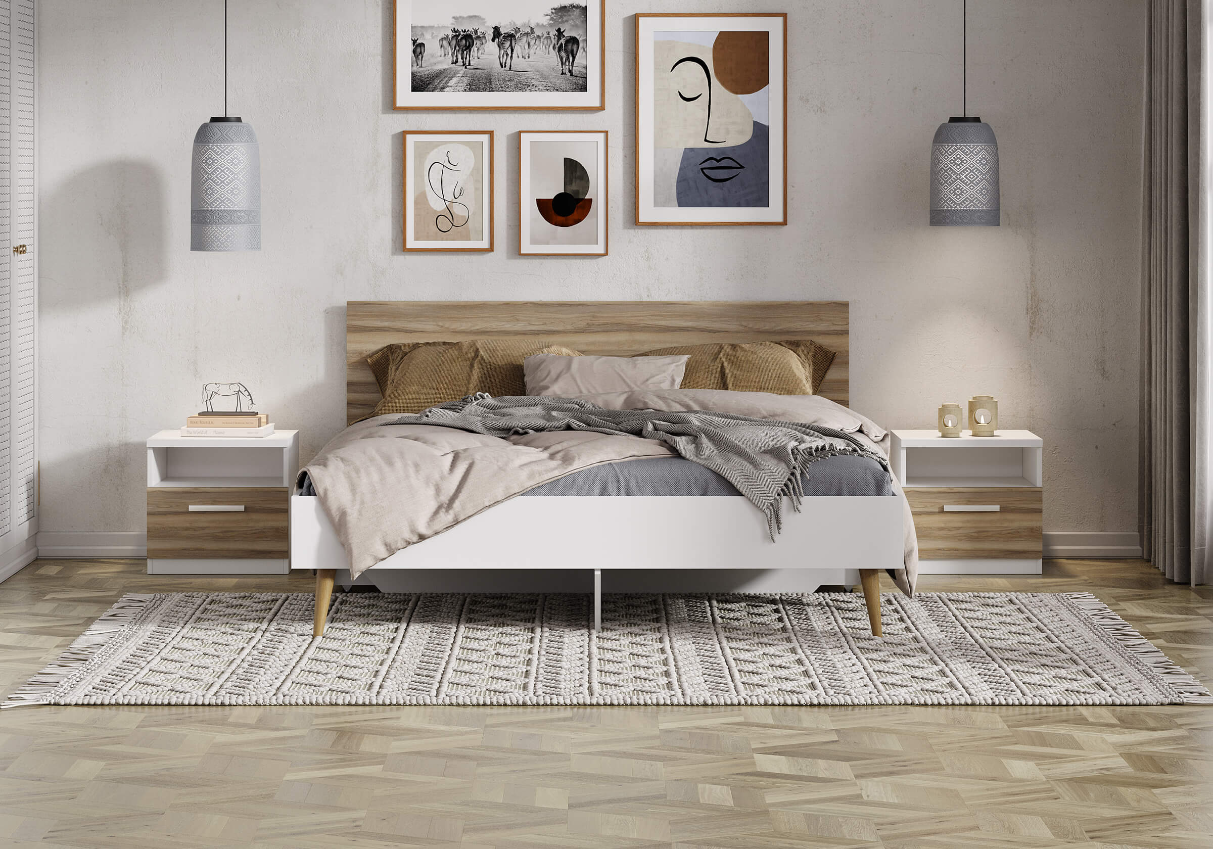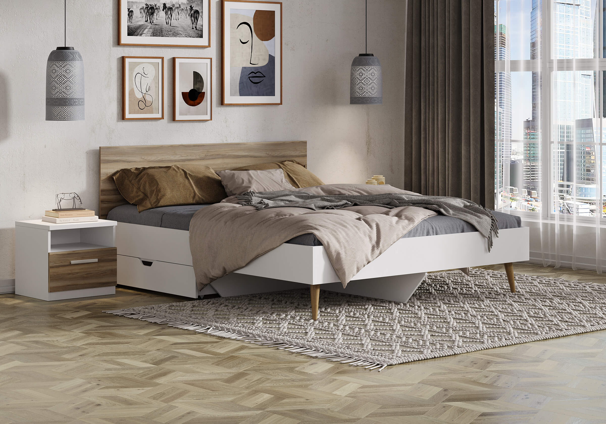 Отличная кровать, подбирали под скандинавский стиль. Сама белая, а спинка из светлого дерева. Не загромождает пространство, выглядит очень легко и воздушно. Внизу кровать укреплена, так что двоих выдерживает. Матрас тоже от сонума, так что спим и высыпаемся отлично. Рекомендую!