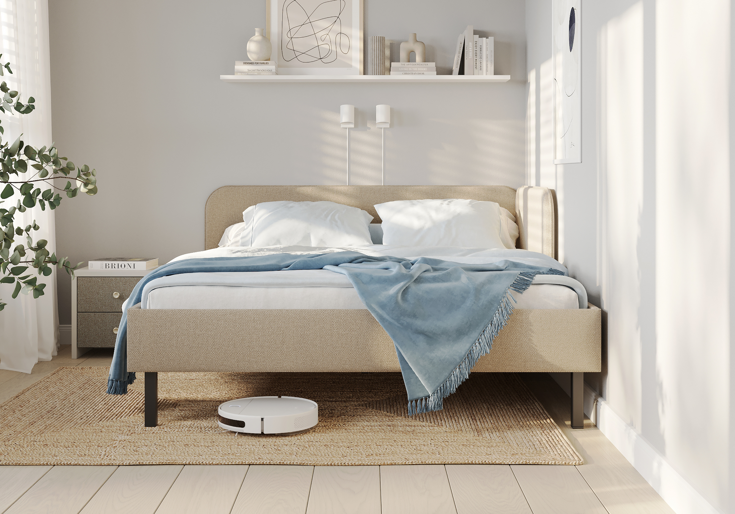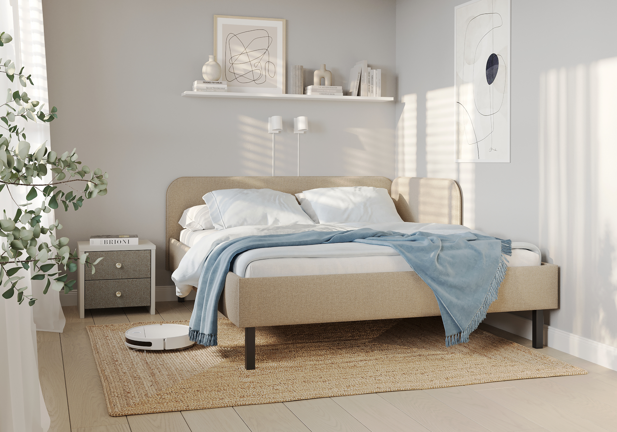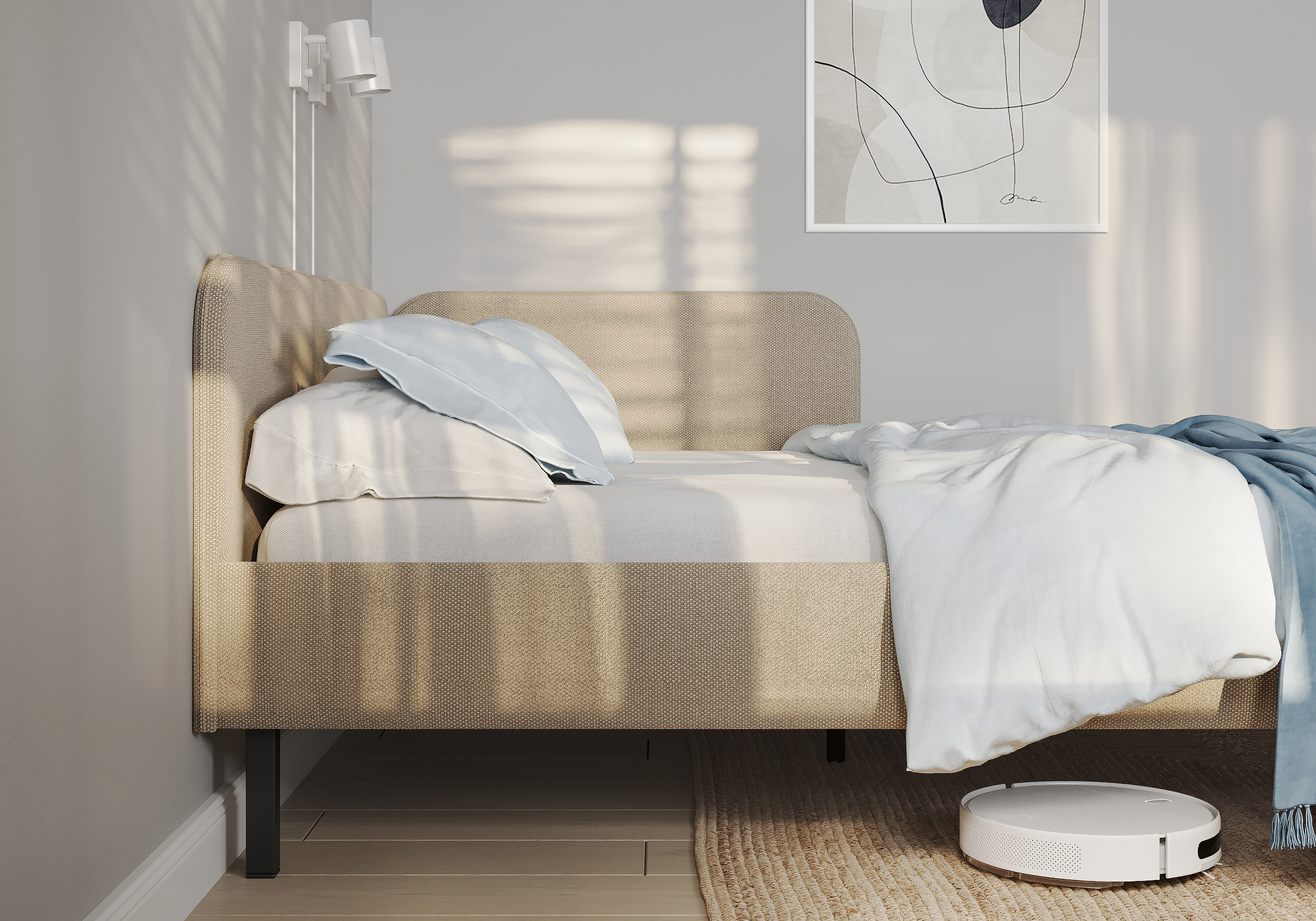 Основание кровати на высоких металлических ножках. Благодаря увеличенной высоте позволяют осуществлять легкую уборку под кроватью, даже с помощью робота-пылесоса.