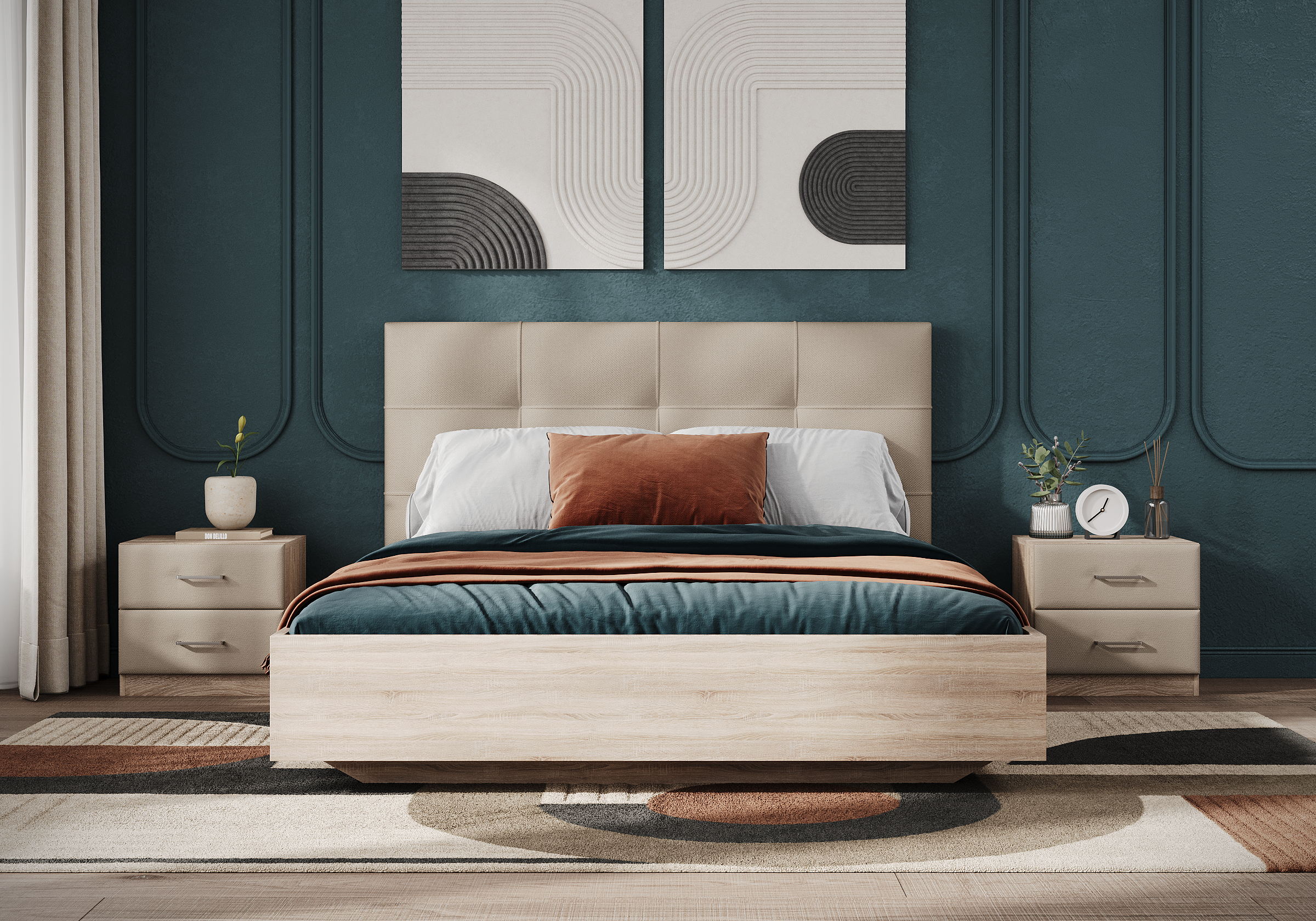 Царги из ЛДСП увеличенной толщины придадут строгость и надежность. Благодаря сочетанию усиленных металлических уголков, ребер жесткости и эксцентриковой стяжке конструктив кровати получается жёстким и прочным.