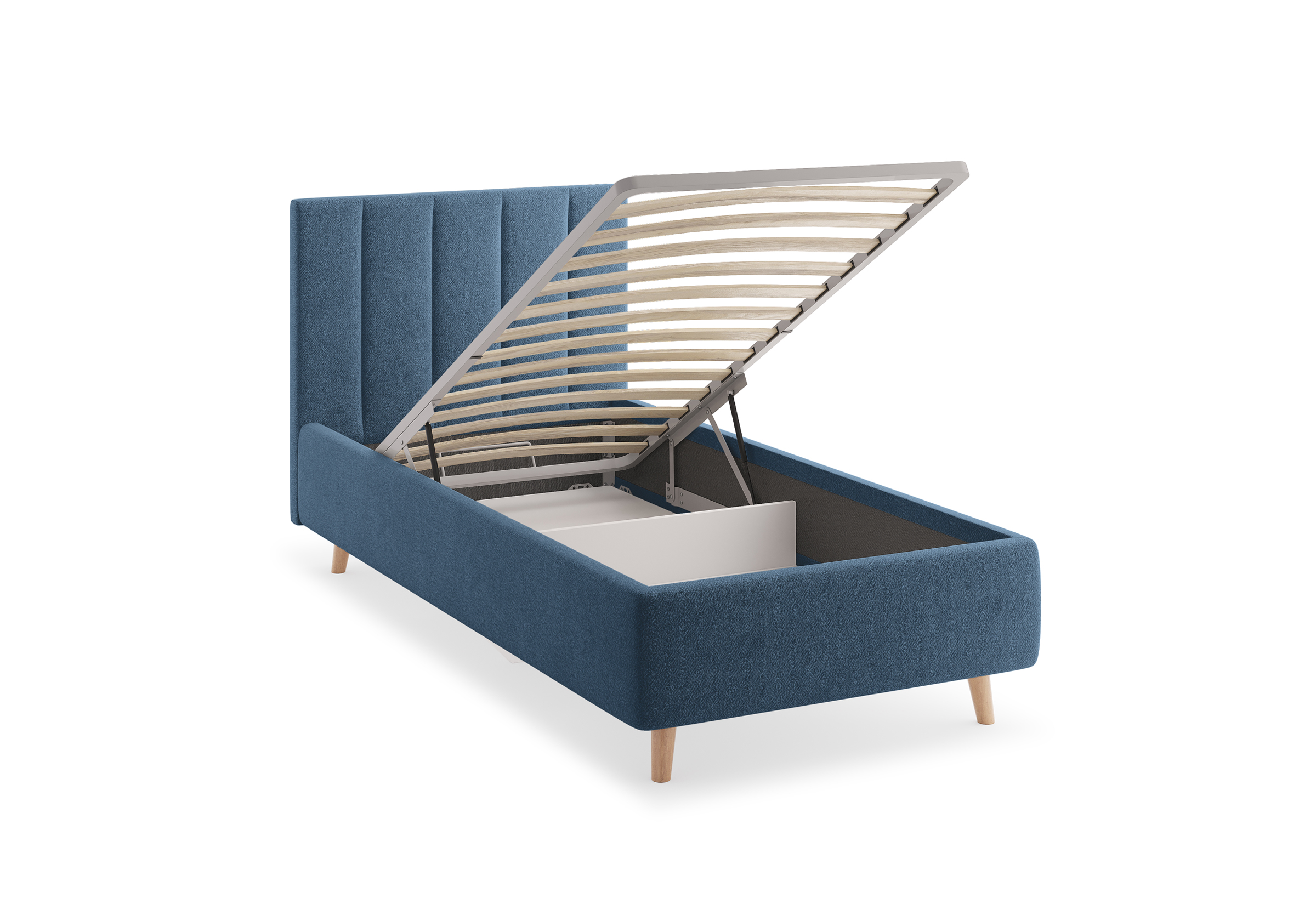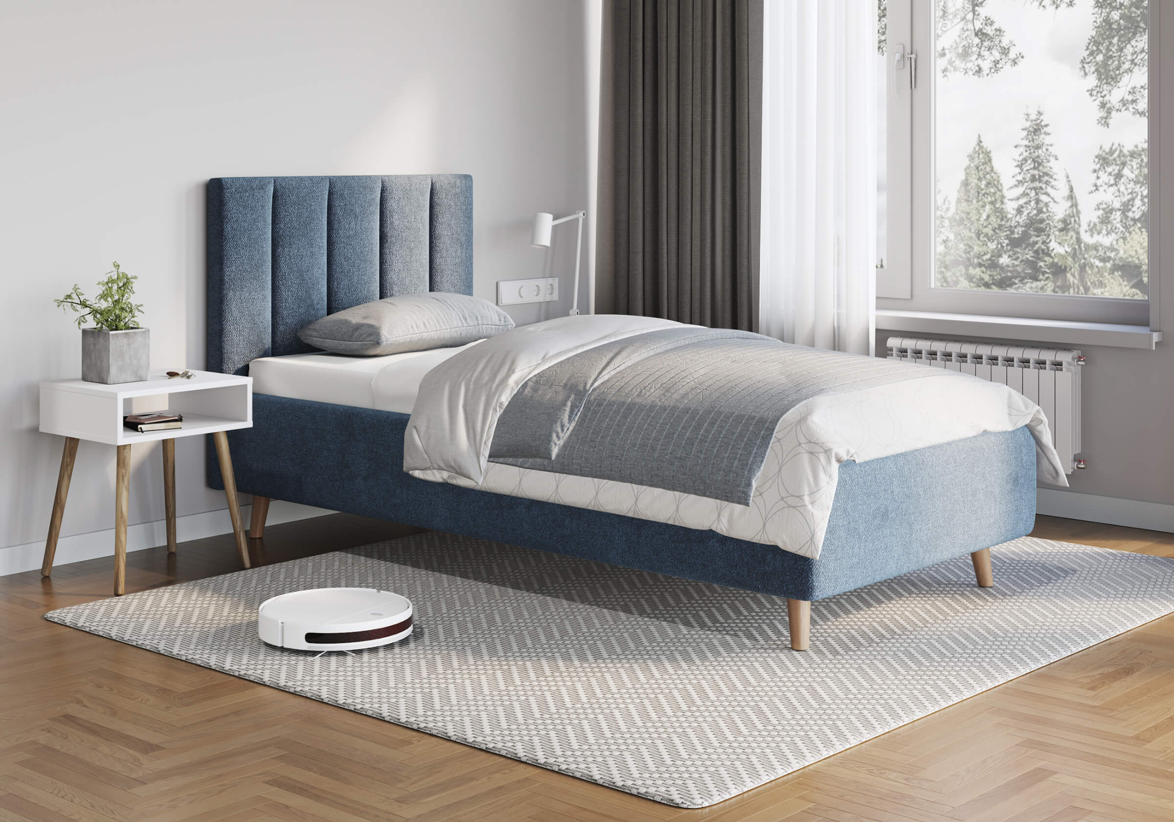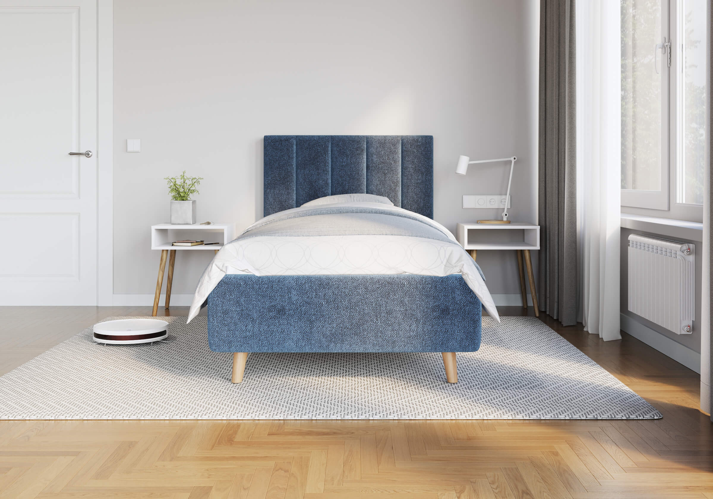 Основание кровати на деревянных ножках. Благодаря увеличенной высоте позволяют осуществлять легкую уборку под кроватью, даже с помощью робота-пылесоса.