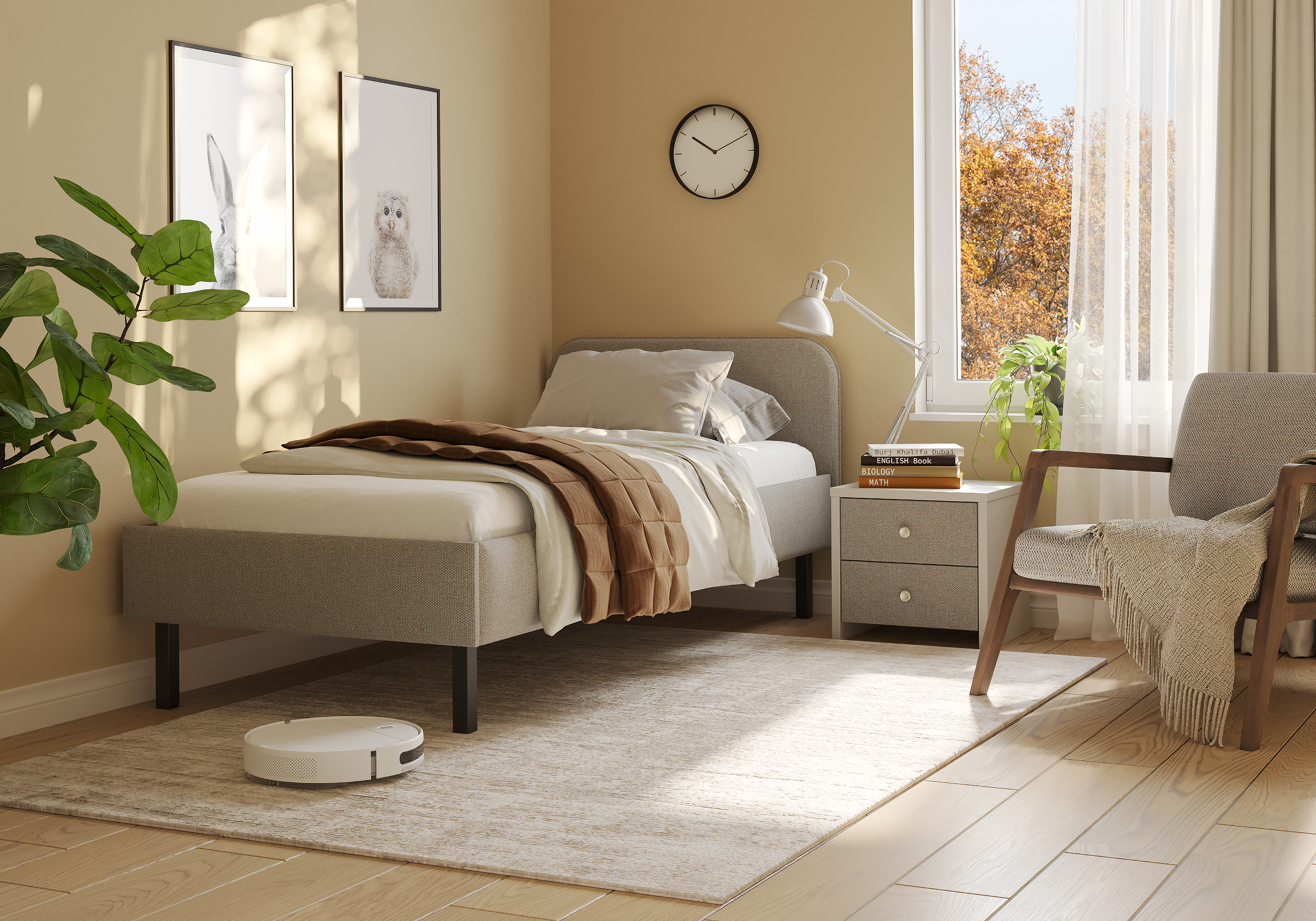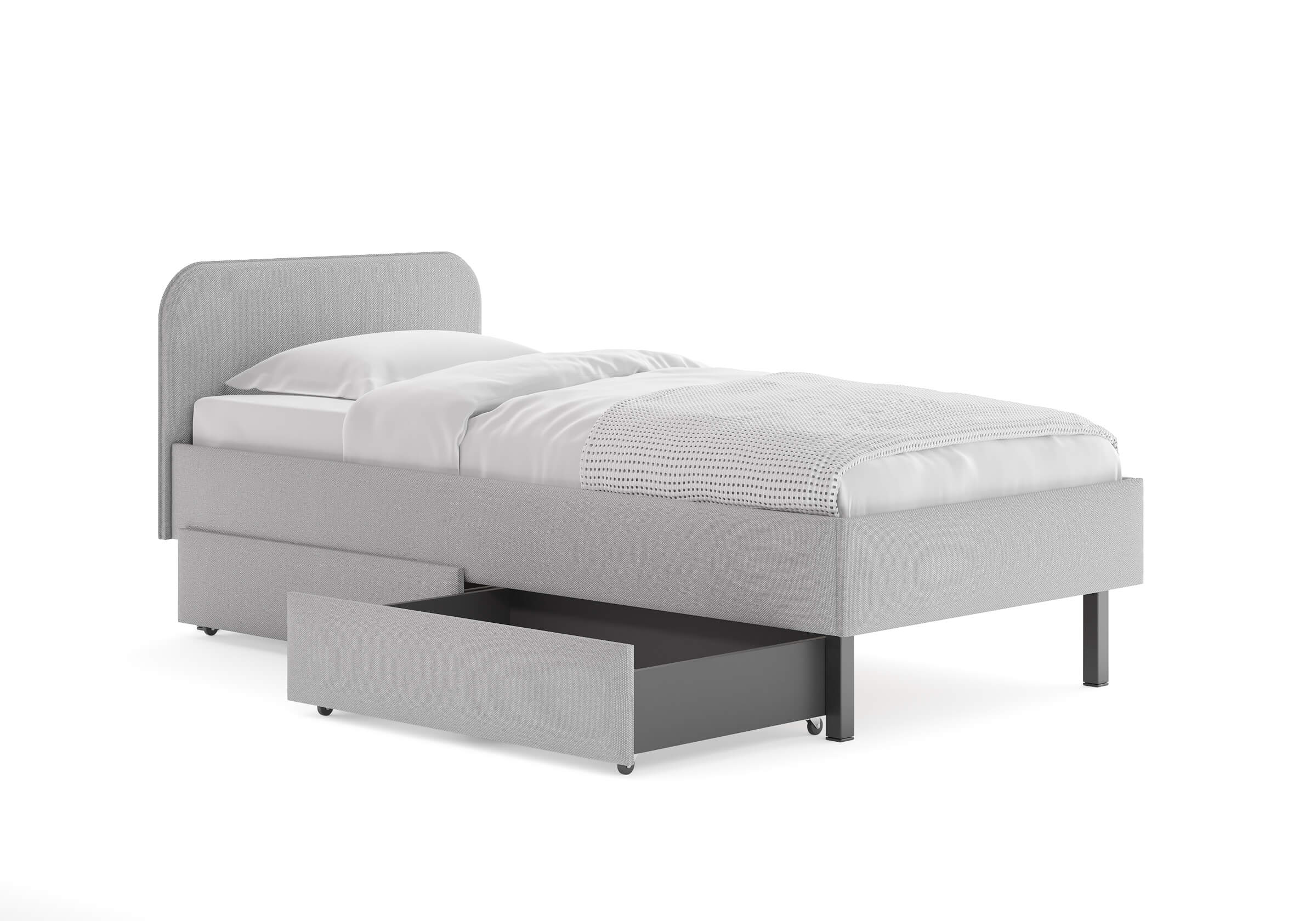 Основание кровати на высоких металлических ножках. Благодаря увеличенной высоте позволяют осуществлять легкую уборку под кроватью, даже с помощью робота-пылесоса.