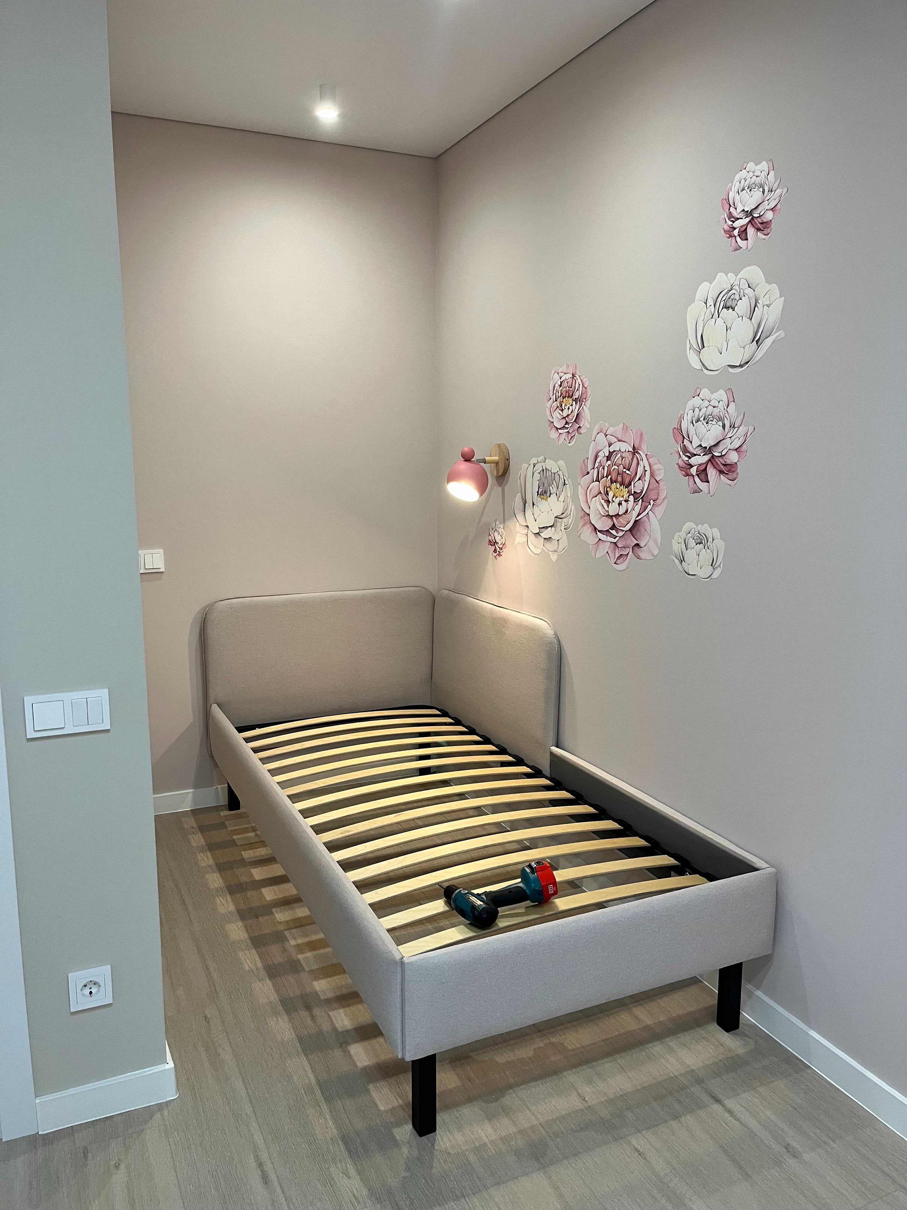 Основание кровати на высоких металлических ножках. Благодаря увеличенной высоте позволяют осуществлять легкую уборку под кроватью, даже с помощью робота-пылесоса.