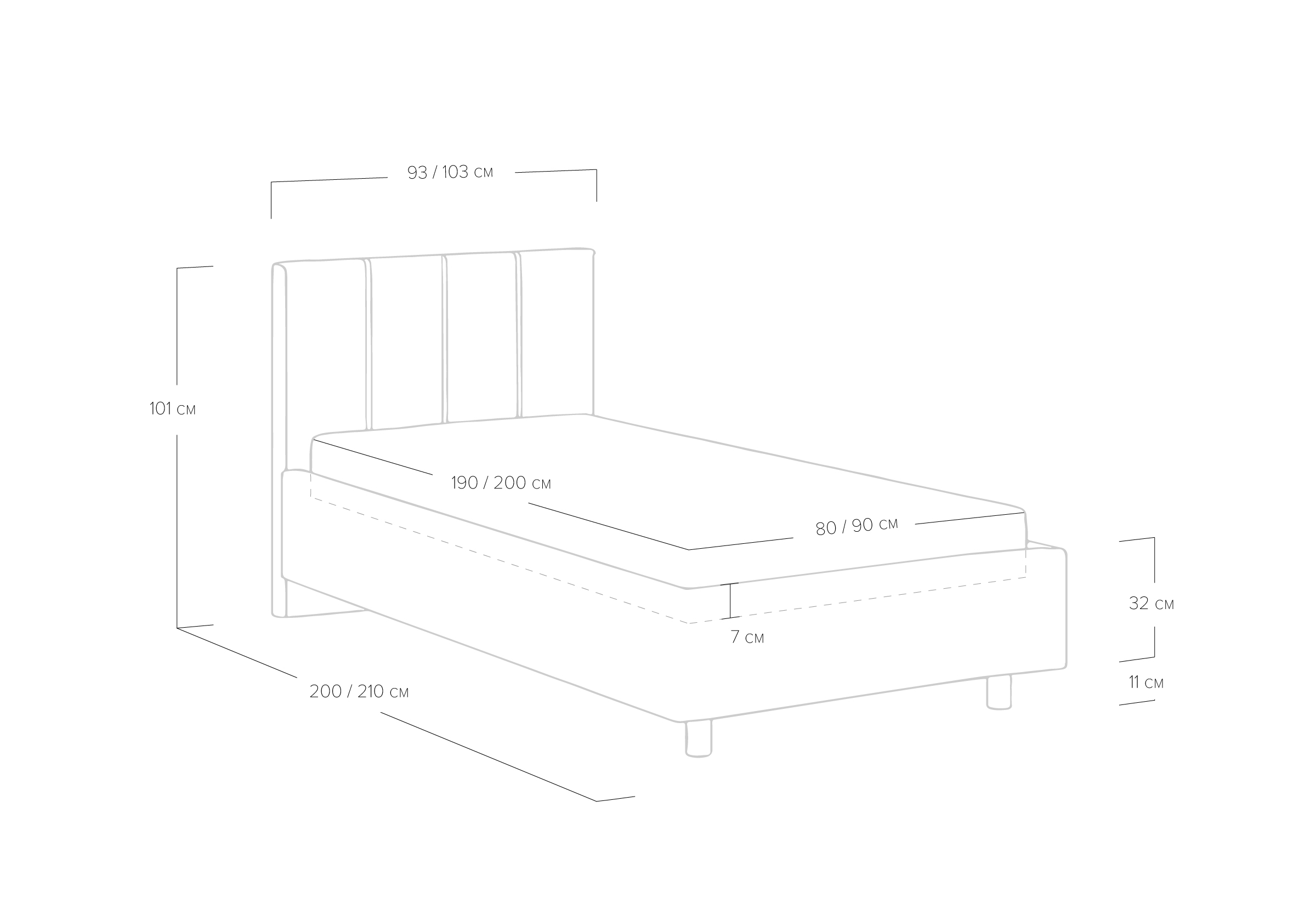 Элегантная кровать с изголовьем украшенным декоративной вертикальной строчкой. Модель изготовлена из ДСП. При необходимости кровать может быть укомплектована разборным или неразборным металлическим основанием с ламелями, подъемным механизмом с бельевым ящиком, трансформируемым основанием Aquarius.