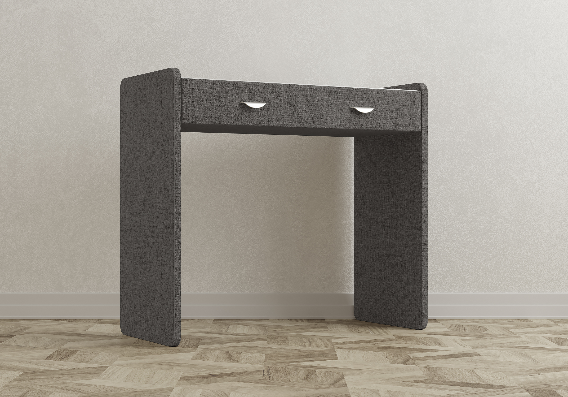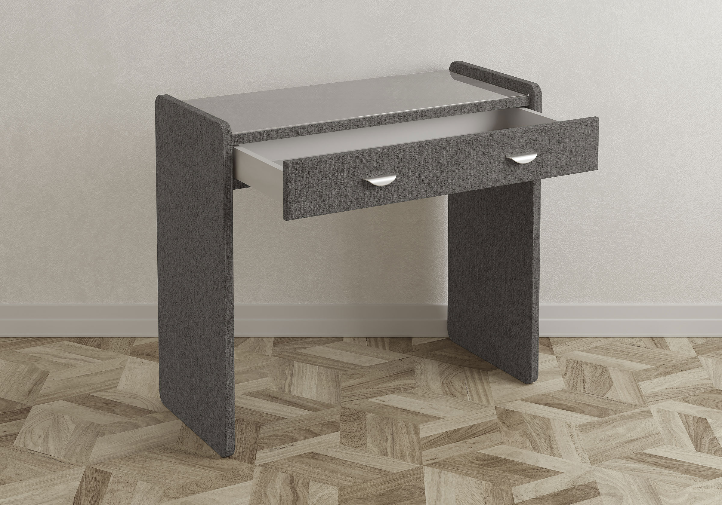 Туалетный столик в мягкой обивке гармонично впишется в любой интерьер. Для удобства использования и продления срока эксплуатации, рекомендуется использовать стеклянную накладку. Накладка используется в качестве столешницы для тумбы и защищает ее от повреждений и загрязнений.