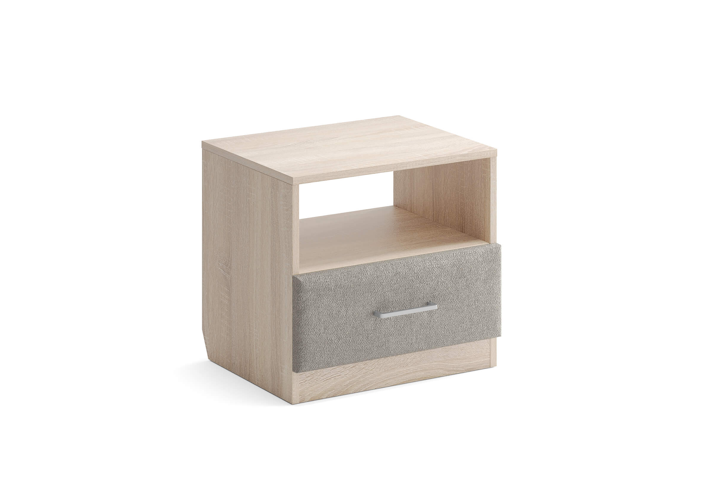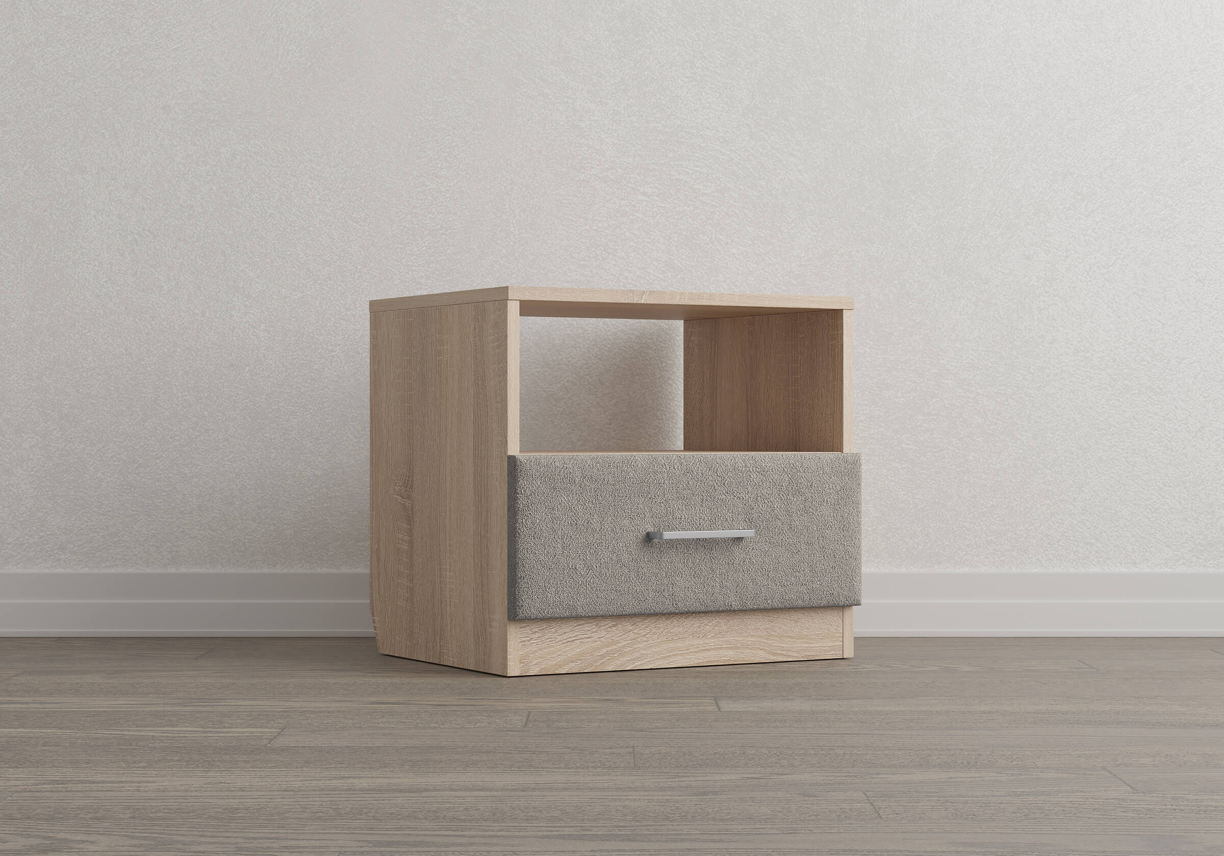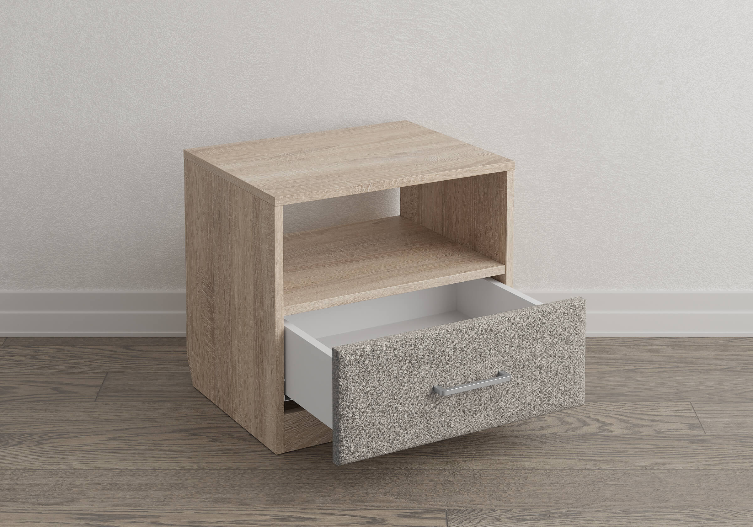 Конструкция тумбы предусматривает два вместительных выдвижных ящика с направляющими скрытого монтажа и доводчиками. Корпус из ЛДСП гарантирует долговечность и устойчивость к механическим повреждениям, а мягкие фасады в ткани и изящные металлические ручки добавят уют.