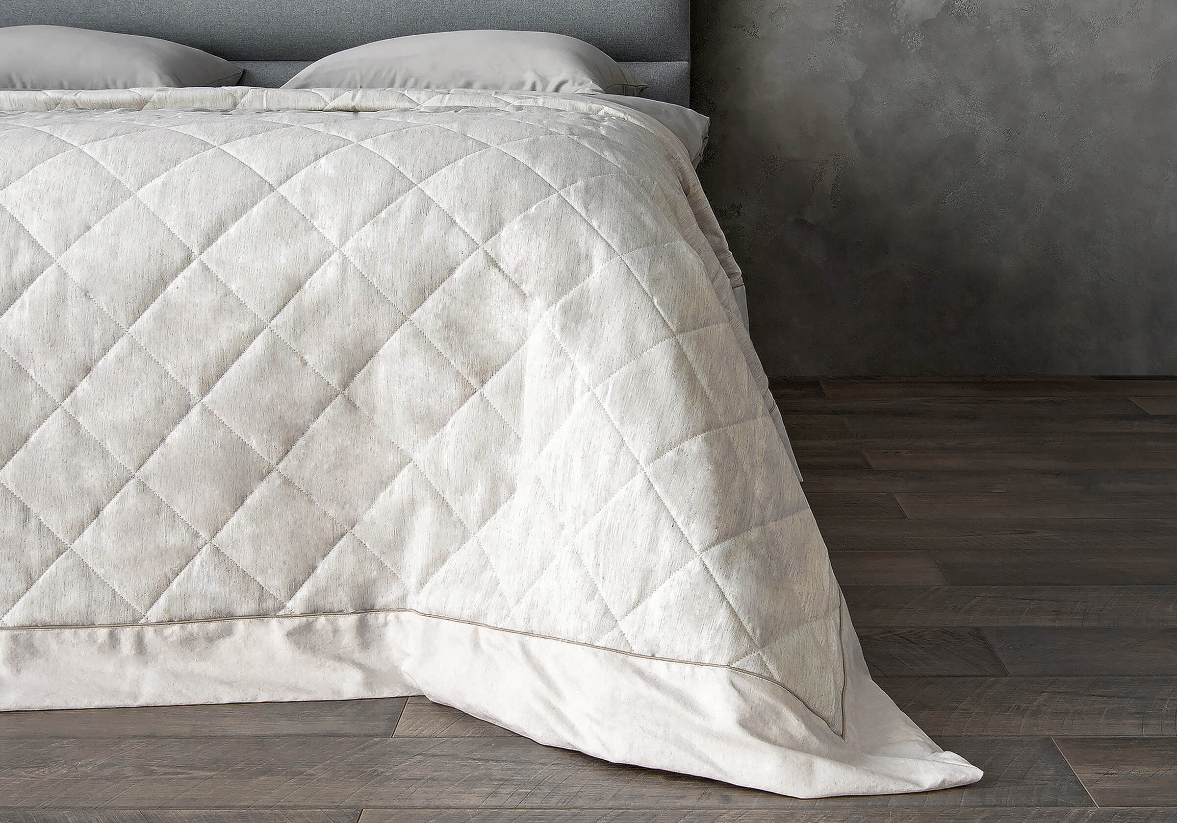 Покрывала Palermo подойдут любителям современного дизайна. Фактурная поверхность ткани и натуральные расцветки дополнены элегантным кантом по периметру. Жаккард на основе хлопка и переработанного полиэфирного волокна имеет объемную стежку в виде ромбов. Покрывала единого размера подойдут для двуспальных кроватей.